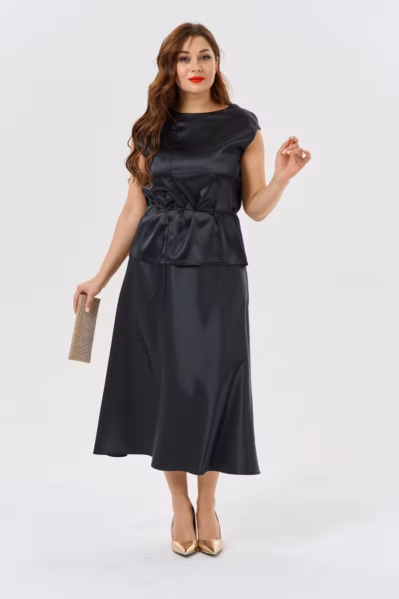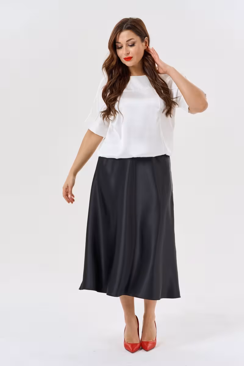 А-силуэт этой юбки создает безупречную женственную линию мягко расширяясь от талии к подолу. Длина ниже середины икры придает образу особую элегантность и загадочность. Широкий пояс на резинке не только обеспечивает идеальную посадку но и подчеркивает талию без лишнего давления.Особый крой по косой делает силуэт более мягким и пластичным. Юбка красиво облегает бедра а затем свободно ниспадает создавая движение при каждом шаге. Такая модель станет основой для множества образов – от романтичных прогулок до вечерних мероприятий.Сочетайте с приталенными топами и блузками чтобы подчеркнуть контраст силуэтов. Для делового образа подойдет строгая рубашка заправленная в пояс. Вечерний лук создается с помощью шелковой блузы и изящных аксессуаров. В прохладную погоду юбка прекрасно смотрится с удлиненными жакетами и кардиганами.Качественная ткань держит форму и комфортна в носке в течение всего дня. Модель подходит для офиса свиданий культурных мероприятий и путешествий.