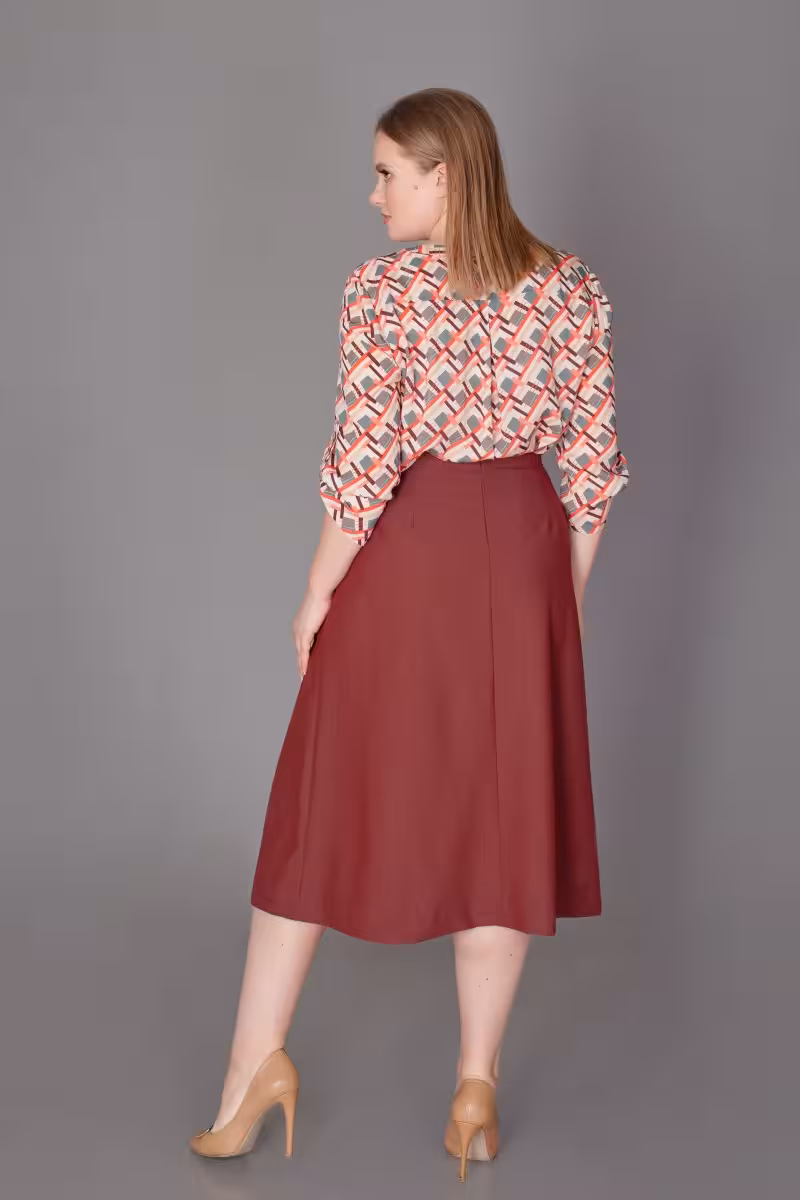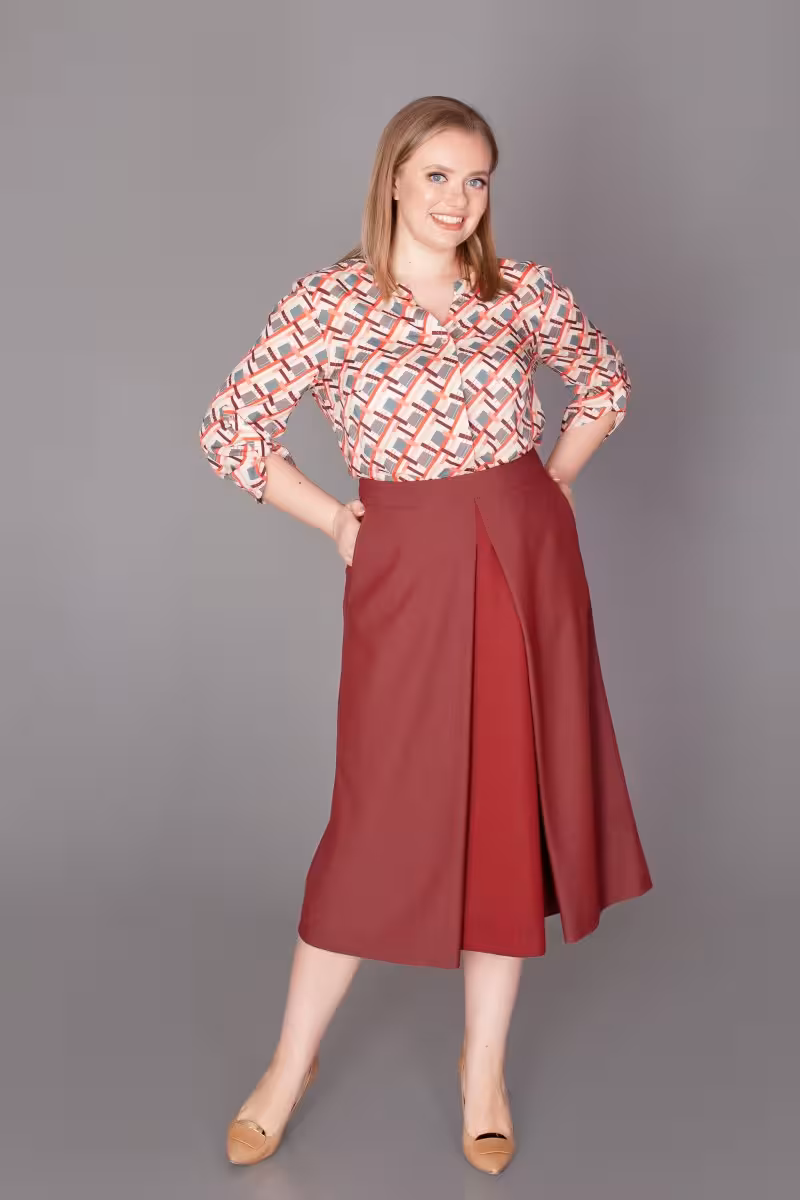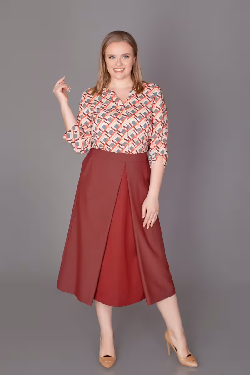 Элегантная юбка длины миди в благородном бордовом оттенке создает безупречный силуэт благодаря крою с запахом. Встречная складка спереди добавляет динамики и визуально стройнит фигуру. Практичные боковые карманы делают образ не только красивым но и функциональным.