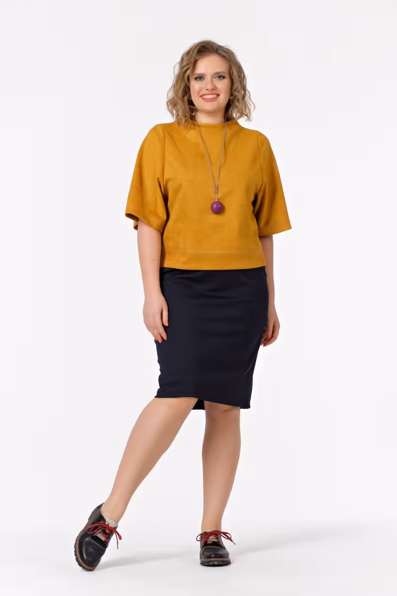 Эта классическая юбка с зауженным силуэтом станет основой для создания элегантных образов в стиле modern classic. Длина ниже колена подчеркивает женственность и создает безупречную линию силуэта. Трикотажное полотно обеспечивает комфорт в течение всего дня и мягко облегает фигуру.Особый шарм модели придают три декоративные складки на заднем полотне – они создают интересную игру линий и добавляют динамику классическому крою. Удобный пояс на широкой вставке обеспечивает идеальную посадку и комфорт при носке.Зауженный к низу силуэт визуально вытягивает фигуру и создает элегантную линию от бедер к коленям. Эта модель plus size разработана с учетом особенностей фигуры и подчеркивает все достоинства силуэта.Юбка отлично сочетается с блузками для деловых встреч с топами для вечерних выходов и с джемперами для повседневных образов. Трикотажная ткань не сковывает движения делая модель идеальным выбором для офиса прогулок и важных мероприятий.