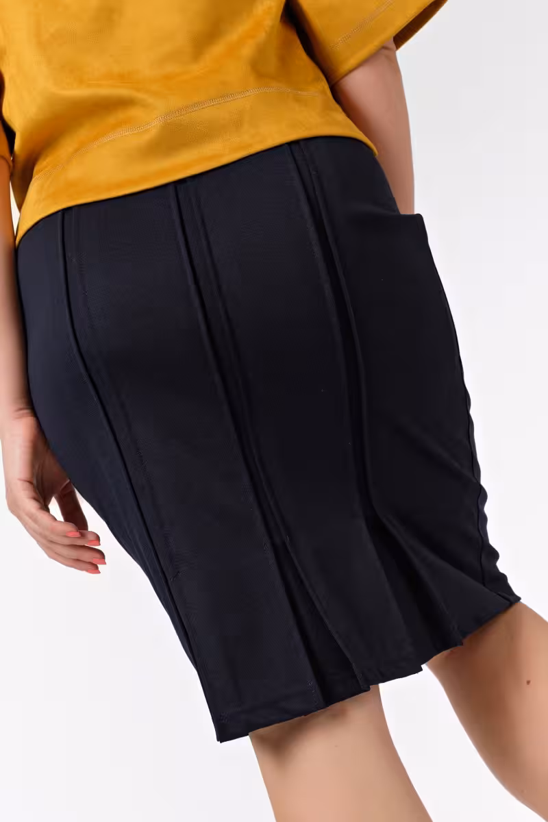 Элегантная юбка с зауженным силуэтом создает изящную линию от бедер к коленям. Трикотажное полотно мягко облегает фигуру а декоративные складки сзади добавляют модели особую изысканность.