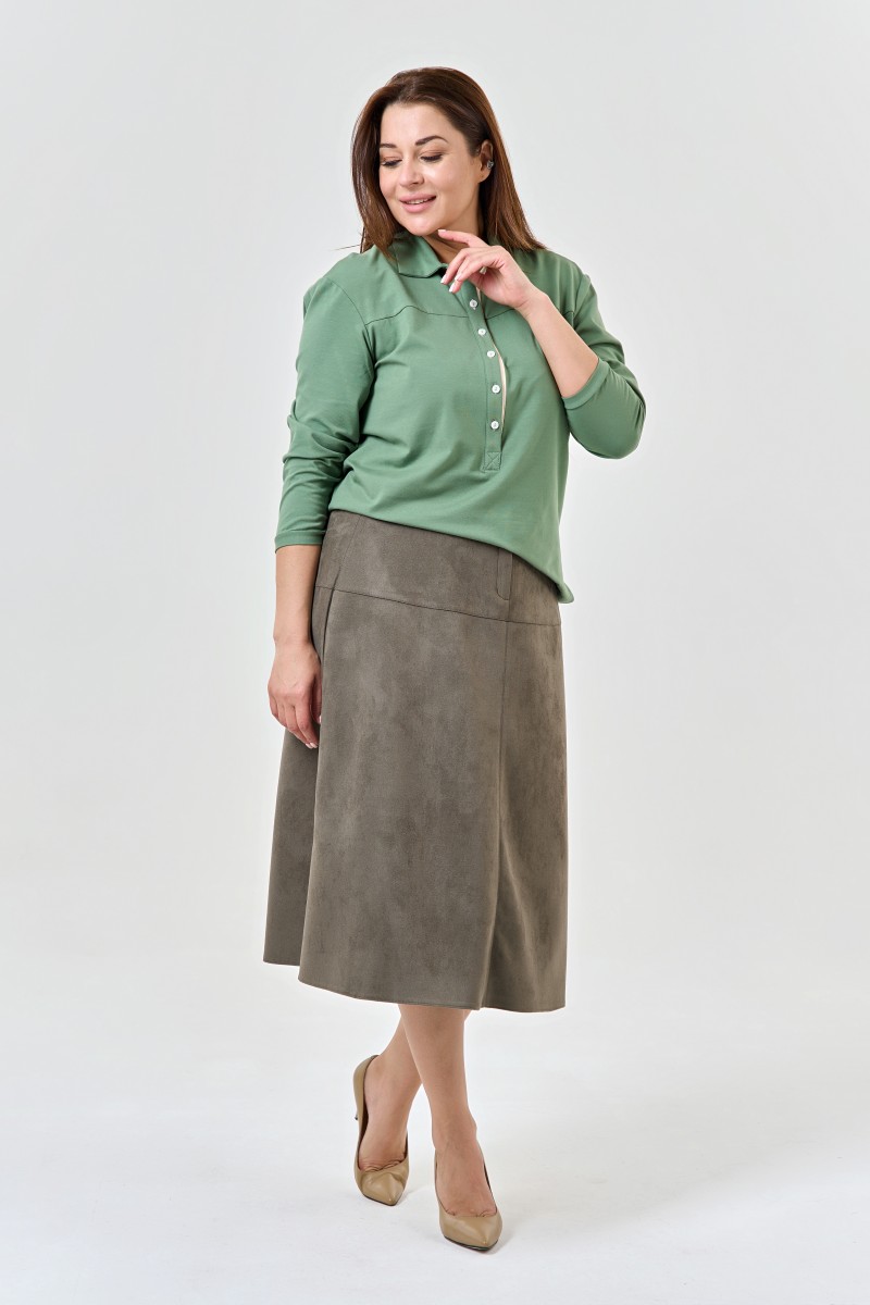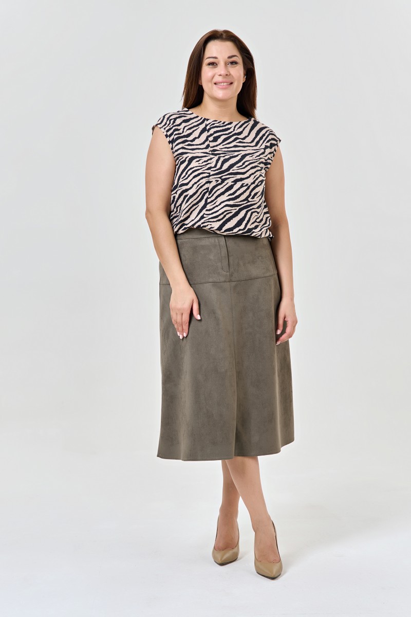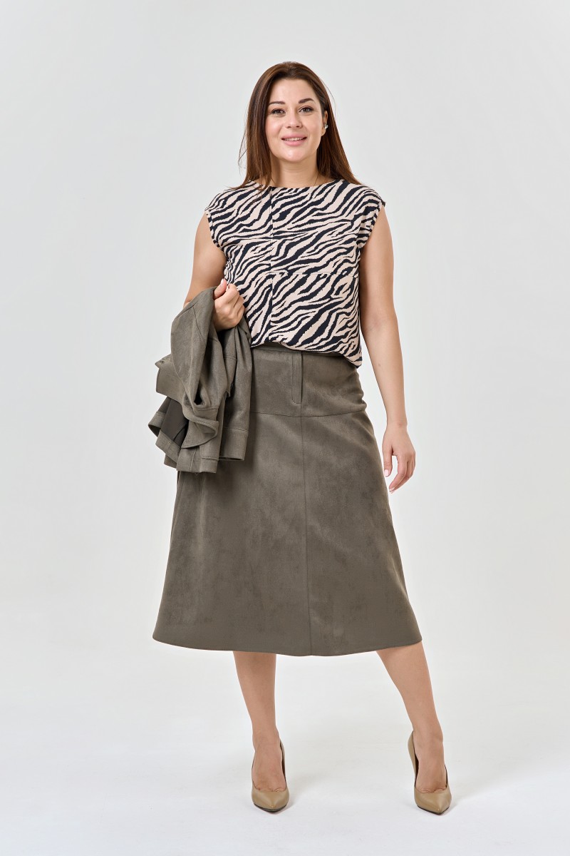 Современная юбка миди из замши цвета хаки.Юбка А-силуэта на кокетке чуть ниже колена.По переду юбки застежка на замок-молнию.По заднему полотнищу средний шов.Пояс на резинке застегивается на пуговицу.