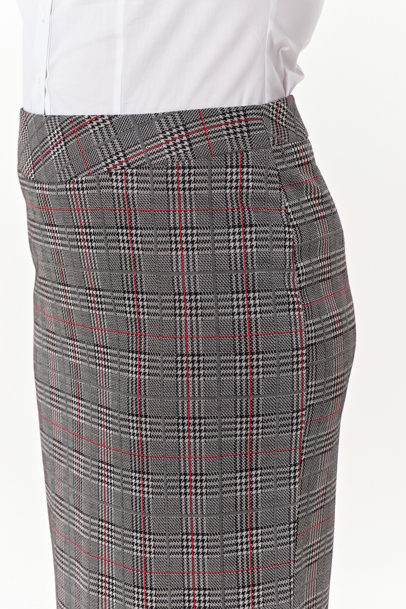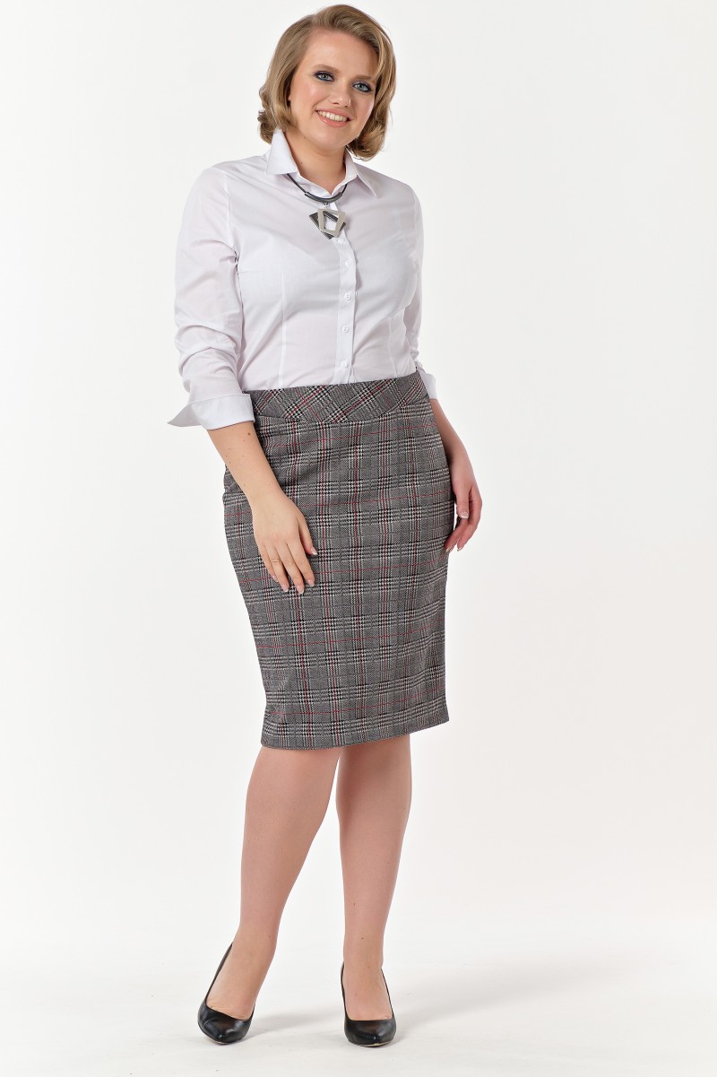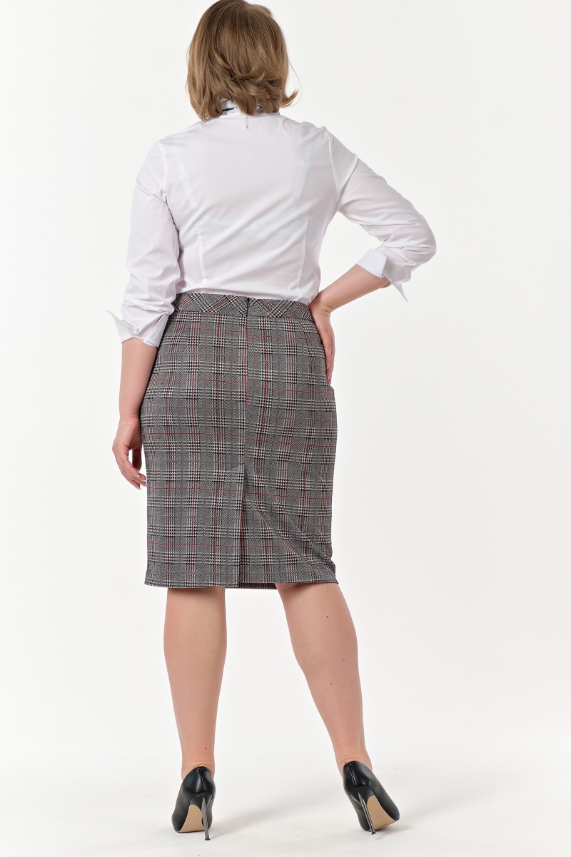 Юбка прямая на подкладке с притачным поясом-кокеткой длина ниже колена. Застежка на потайную «молнию» в среднем шве спинки. На переде в шве притачивания кокетки функциональные карманы. Удобство в движении обеспечивает шлица в нижней части среднего шва сп