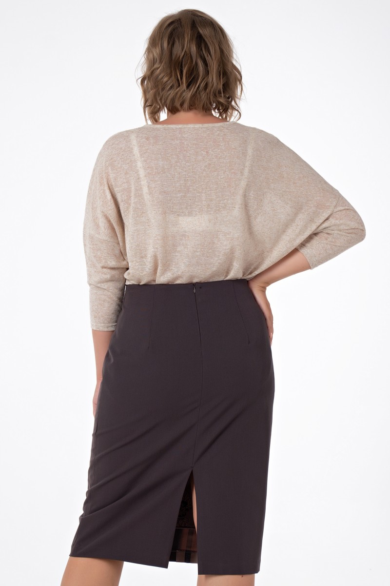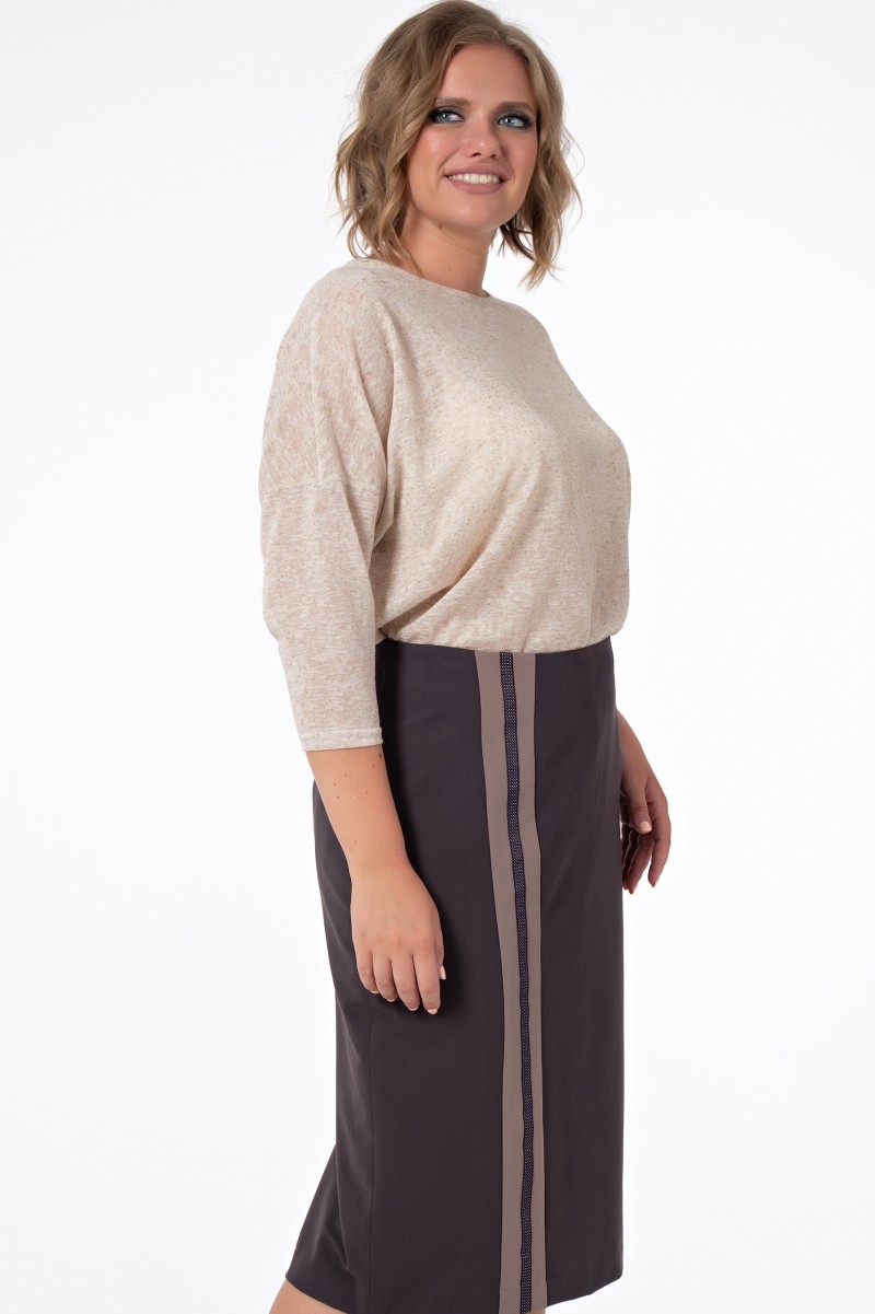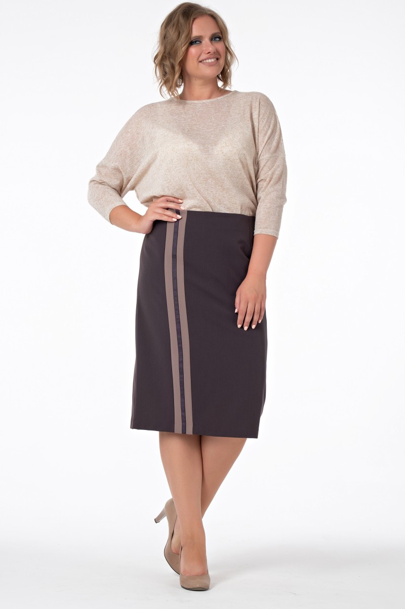 Юбка классическая длиной ниже колена зауженная к низу с отлетной подкладкой верхний срез обработан обтачкой. Переднее полотнище с вертикальной вставкой из отделочной ткани и декоративной лентой./Заднее полотнище с двумя талиевыми вытачками со средним