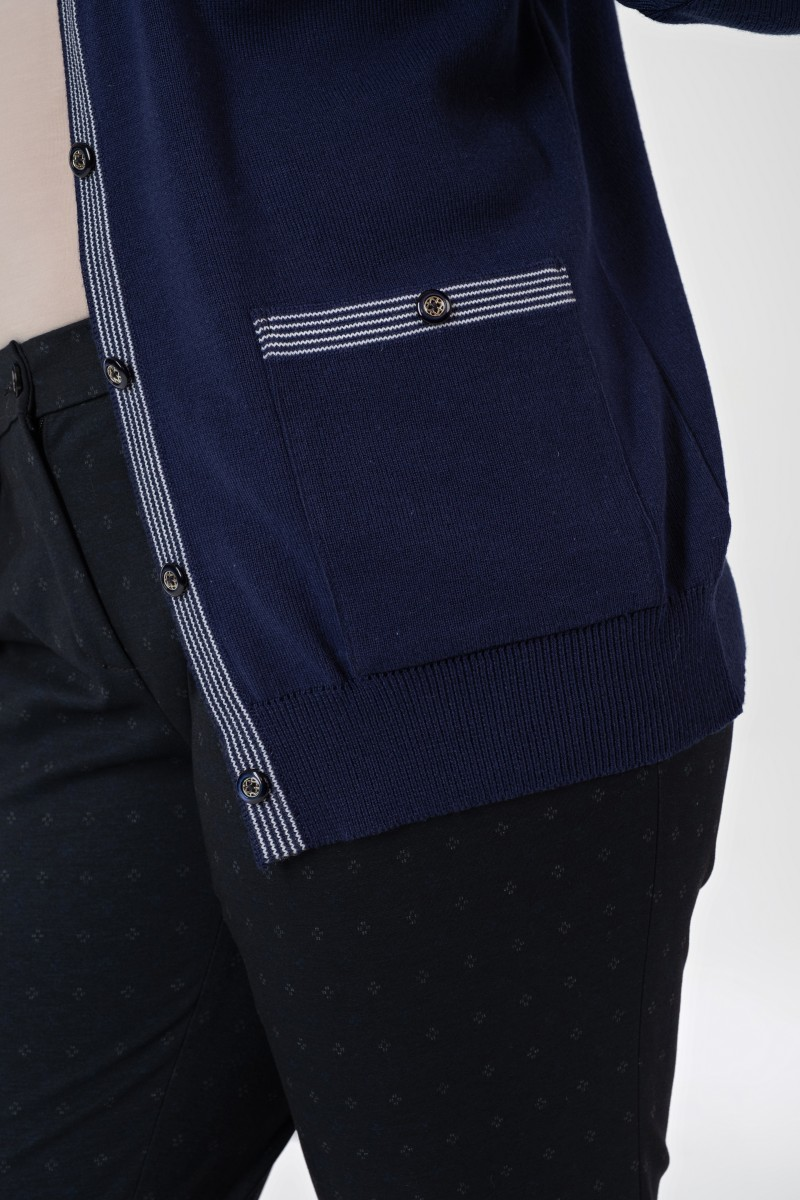 Вязаный жакет глубокого синего оттенка становится основой для создания продуманных образов. Прямой силуэт и V-образный вырез визуально вытягивают фигуру а мягкая фактура трикотажа дарит ощущение уюта в течение дня.