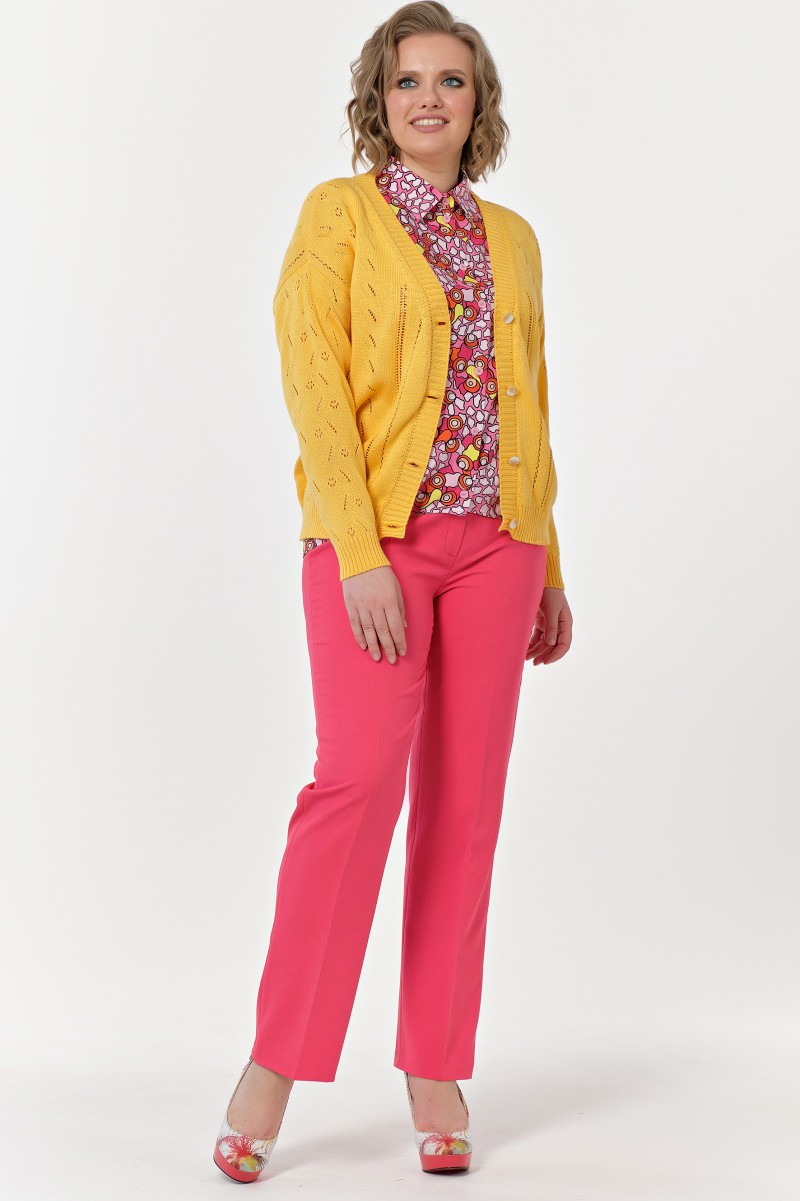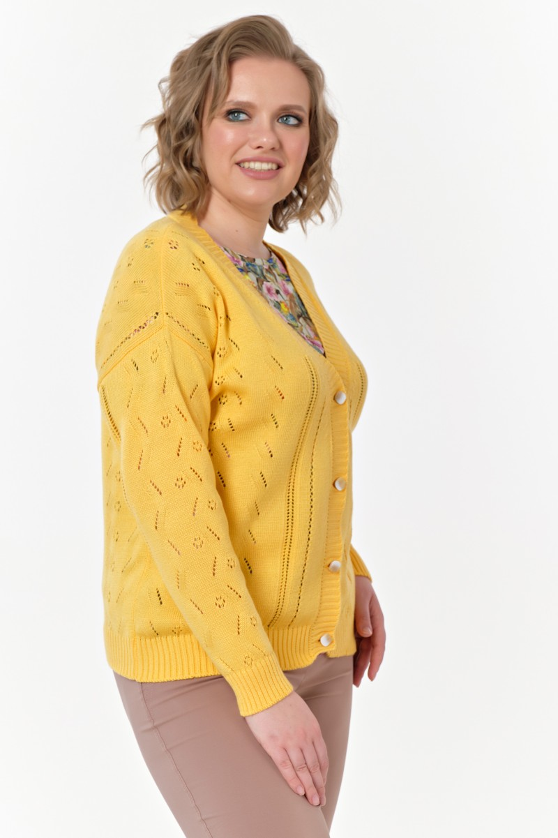 Этот вязаный жакет в насыщенном горчичном цвете станет ярким акцентом весенне-летнего гардероба. Воздушная ажурная вязка создает изысканную игру света и тени добавляя образу романтичности и женственности. Прямой силуэт длиной до бедер универсально подходит разным типам фигуры а V-образная горловина визуально удлиняет шею и подчеркивает декольте.Четыре аккуратные пуговицы по центру позволяют носить жакет как распахнутым так и застегнутым. Длинные рукава с декоративным швом выше локтя добавляют интересную деталь лаконичному дизайну. Мягкий трикотаж приятен к телу и обеспечивает комфорт в течение всего дня.Жакет прекрасно сочетается с деловыми прямыми брюками для офиса создавая элегантный профессиональный образ. Для прогулки его можно комбинировать со свободными брюками-бананами или джинсами скинни. Вечерний лук получится особенно эффектным в дуэте с зауженными брюками и изящным топом.Универсальная вещь для деловых встреч путешествий и повседневной жизни. Качественная вязка сохраняет форму после стирк