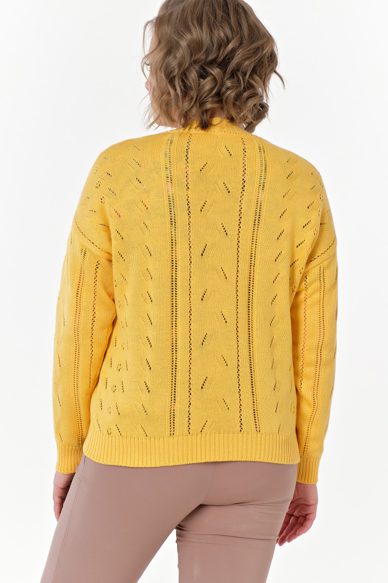 Солнечный горчичный оттенок мгновенно преображает любой образ. Воздушная ажурная вязка создает романтичное настроение а прямой силуэт подчеркивает элегантность линий.