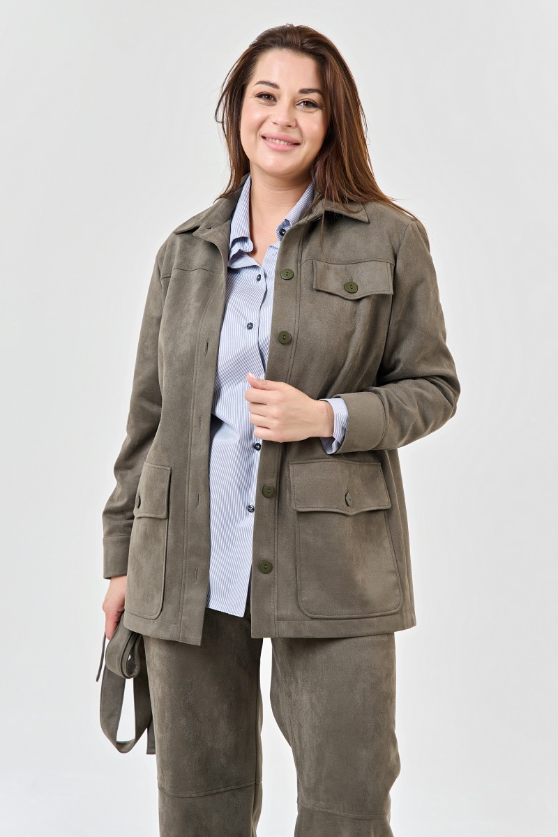 Жакет прямого силуэта в благородном оливковом цвете станет основой стильного гардероба. Классический отложной воротник и элегантная застежка на шесть пуговиц создают безупречный силуэт. Завязывающийся пояс позволяет подчеркнуть талию или носить жакет свободно для более расслабленного образа.Продуманные детали делают модель особенной: накладные карманы с клапанами добавляют практичности и характера а аккуратные застежки на рукавах подчеркивают внимание к деталям. Отсутствие подкладки обеспечивает комфорт в межсезонье.Этот жакет универсален в сочетаниях. С прямыми брюками высокой посадки создает идеальный деловой образ для офиса и важных встреч. С зауженными джинсами превращается в стильный casual-лук для прогулок и встреч с друзьями. Брюки-палаццо добавят образу современной элегантности для вечернего выхода.Оливковый цвет прекрасно сочетается с белыми блузками полосатыми футболками и нейтральными оттенками. Качественная ткань держит форму и дарит ощущение уверенности на весь день.