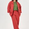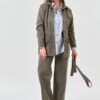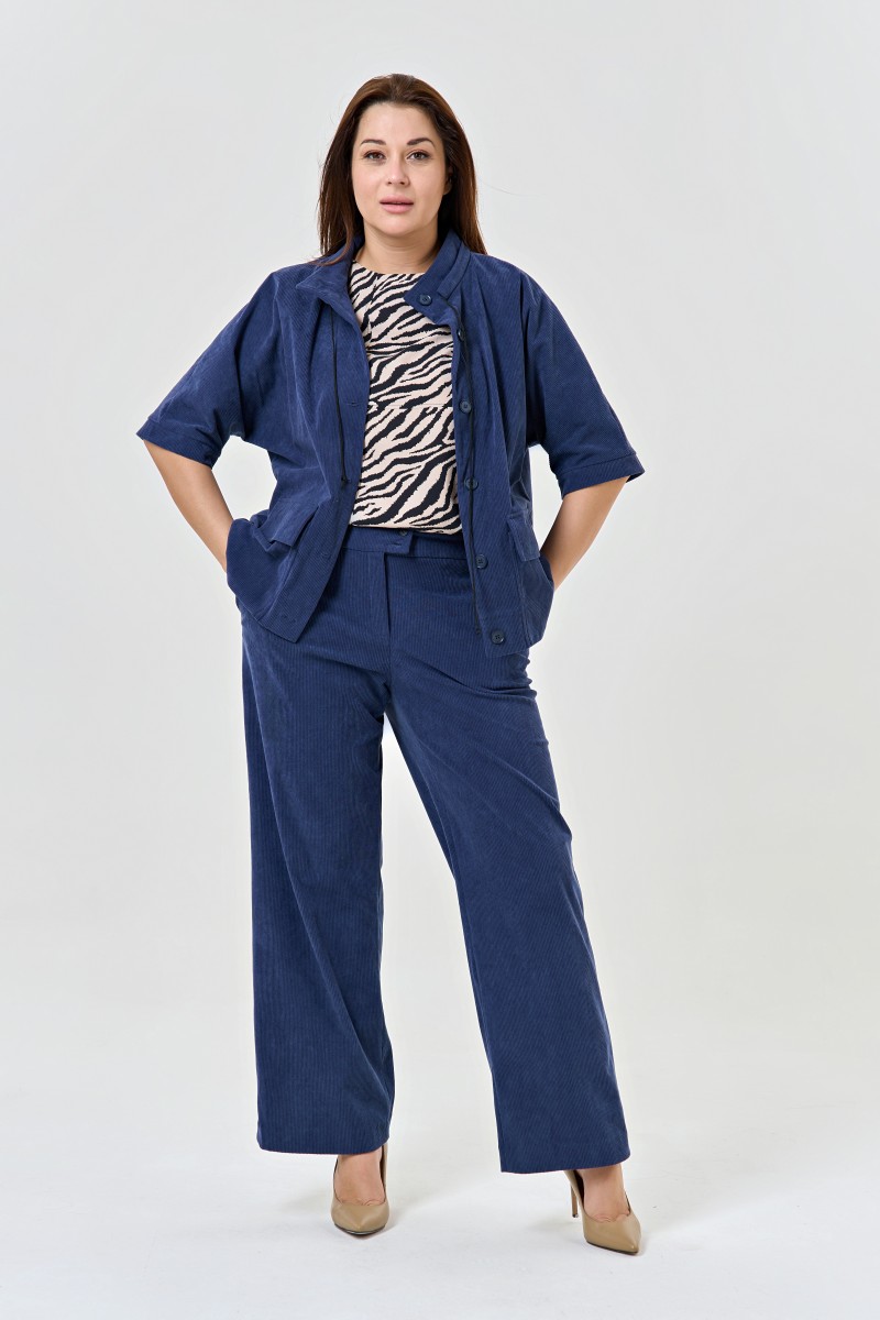 Жакет из крупного вельвета прямого силуэта с цельнокроеным рукавом.Перед с центральной застежкой до верха на обметанные петли и пуговицы.Жакет с двумя накладными карманами с клапанами. Рукава с притачными манжетами. Воротник – стойка застегивающаяся на одну обметанную петлю и пуговицу с кулиской.
