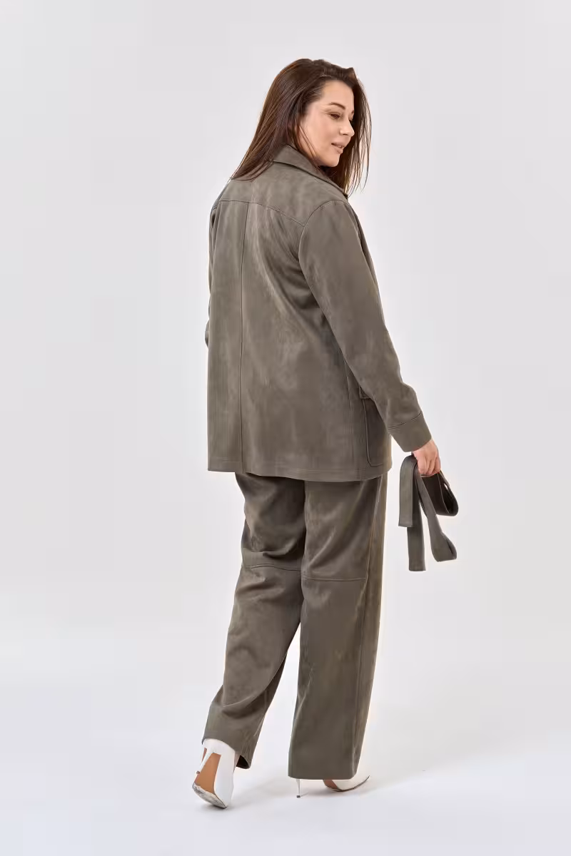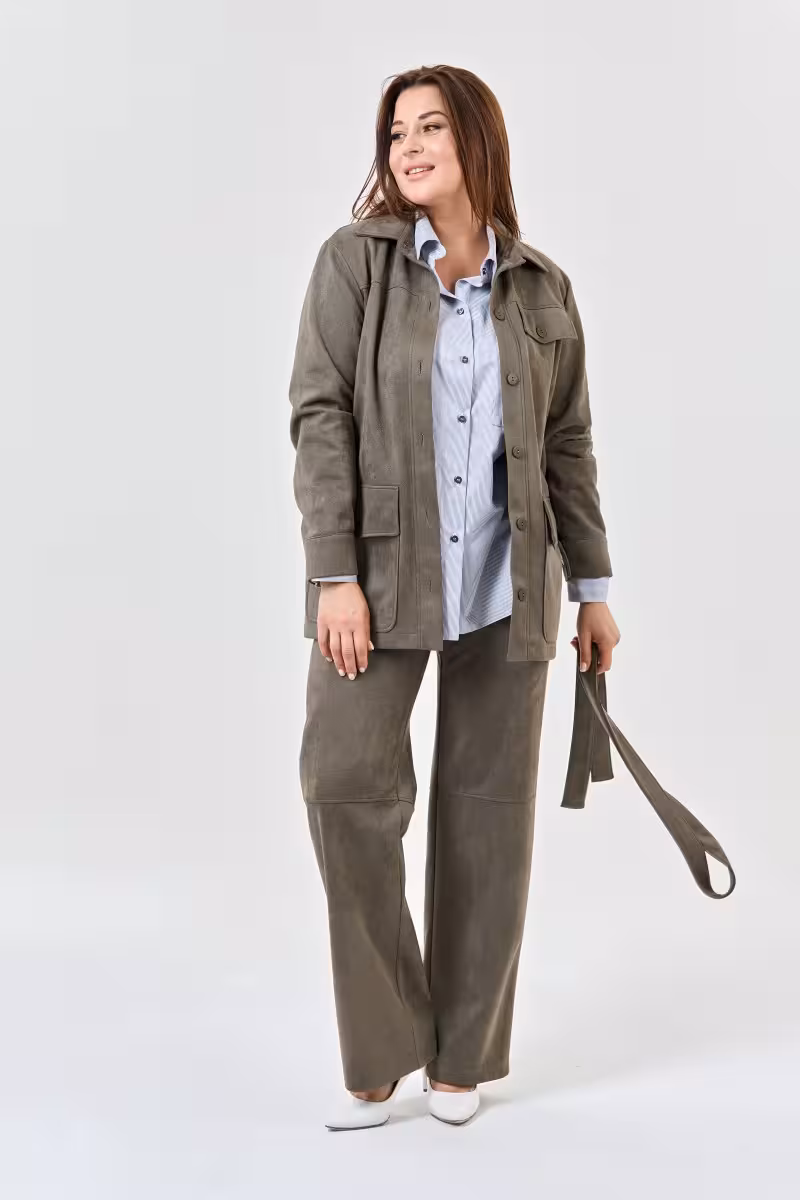 Жакет прямого силуэта в благородном оливковом цвете станет основой стильного гардероба. Классический отложной воротник и элегантная застежка на шесть пуговиц создают безупречный силуэт. Завязывающийся пояс позволяет подчеркнуть талию или носить жакет свободно для более расслабленного образа.Продуманные детали делают модель особенной: накладные карманы с клапанами добавляют практичности и характера а аккуратные застежки на рукавах подчеркивают внимание к деталям. Отсутствие подкладки обеспечивает комфорт в межсезонье.Этот жакет универсален в сочетаниях. С прямыми брюками высокой посадки создает идеальный деловой образ для офиса и важных встреч. С зауженными джинсами превращается в стильный casual-лук для прогулок и встреч с друзьями. Брюки-палаццо добавят образу современной элегантности для вечернего выхода.Оливковый цвет прекрасно сочетается с белыми блузками полосатыми футболками и нейтральными оттенками. Качественная ткань держит форму и дарит ощущение уверенности на весь день.