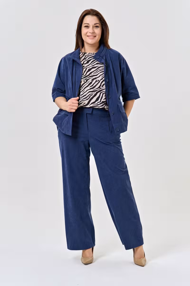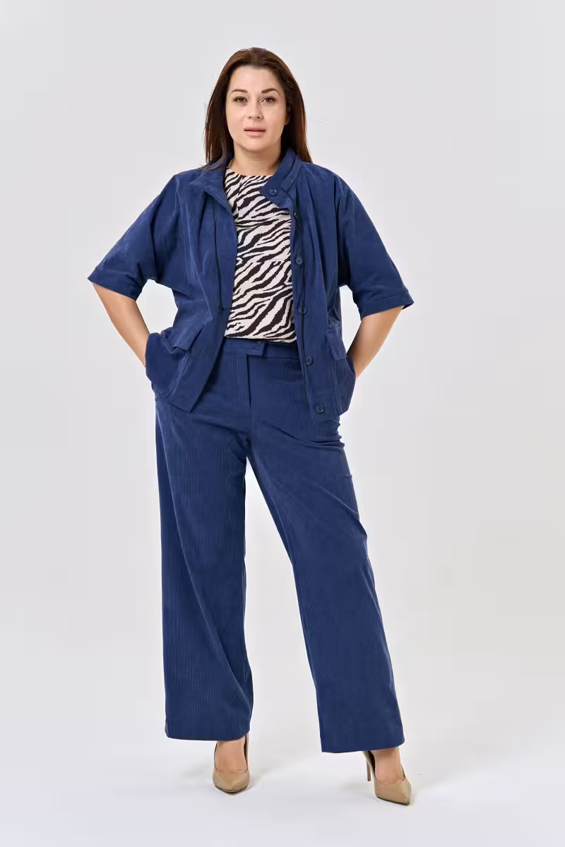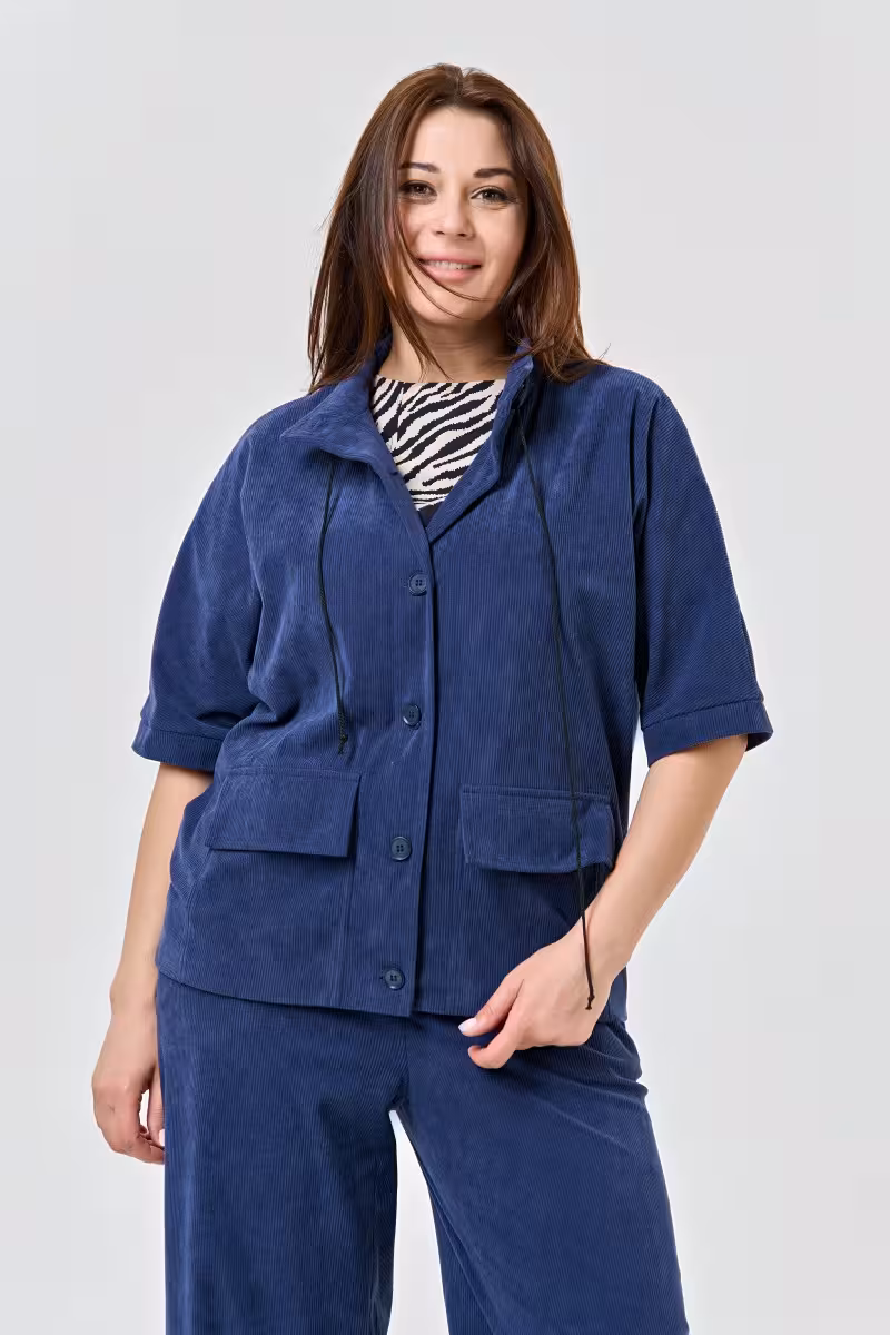 Вельветовый жакет становится основой для множества образов благодаря своей универсальности. Крупный вельвет создает богатую фактуру и приятные тактильные ощущения а глубокий синий оттенок легко сочетается с другими цветами гардероба. Прямой силуэт с цельными рукавами формирует лаконичный современный образ не скрывая естественные пропорции фигуры.Воротник-стойка с застежкой и регулируемым шнуром позволяет варьировать степень открытости образа. Два накладных кармана с клапанами добавляют функциональности и поддерживают общую стилистику жакета. Рукава завершаются аккуратными манжетами на пуговицах.Этот жакет отлично работает в деловых образах в паре с прямыми брюками высокой посадки или зауженными для более современного звучания. Для офисных встреч дополните образ классической блузкой а для прогулок – футболкой или топом. Натуральный состав вельвета обеспечивает комфорт в течение дня позволяя чувствовать себя уверенно в любой ситуации.