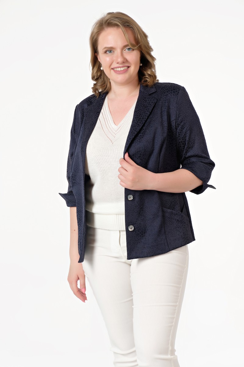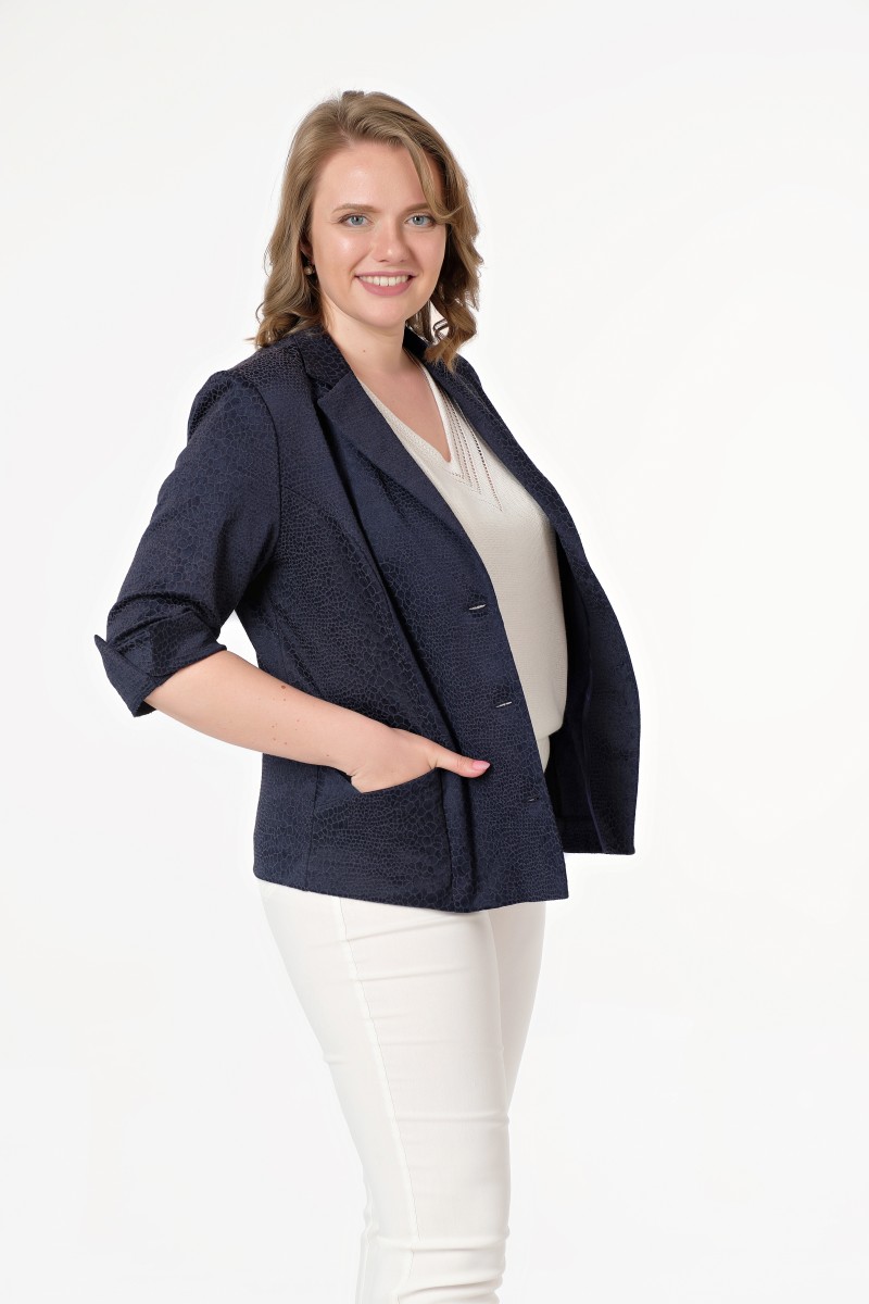 Жакет женский полуприлегающего силуэта длиной до линии бедер. Перед с вертикальными рельефами выходящими из пройм и карманами. Воротник с лацканами. Застежка центральная на 3 пуговицы и выметанные петли. Спинка с вытачками обеспечивающими умеренное прил