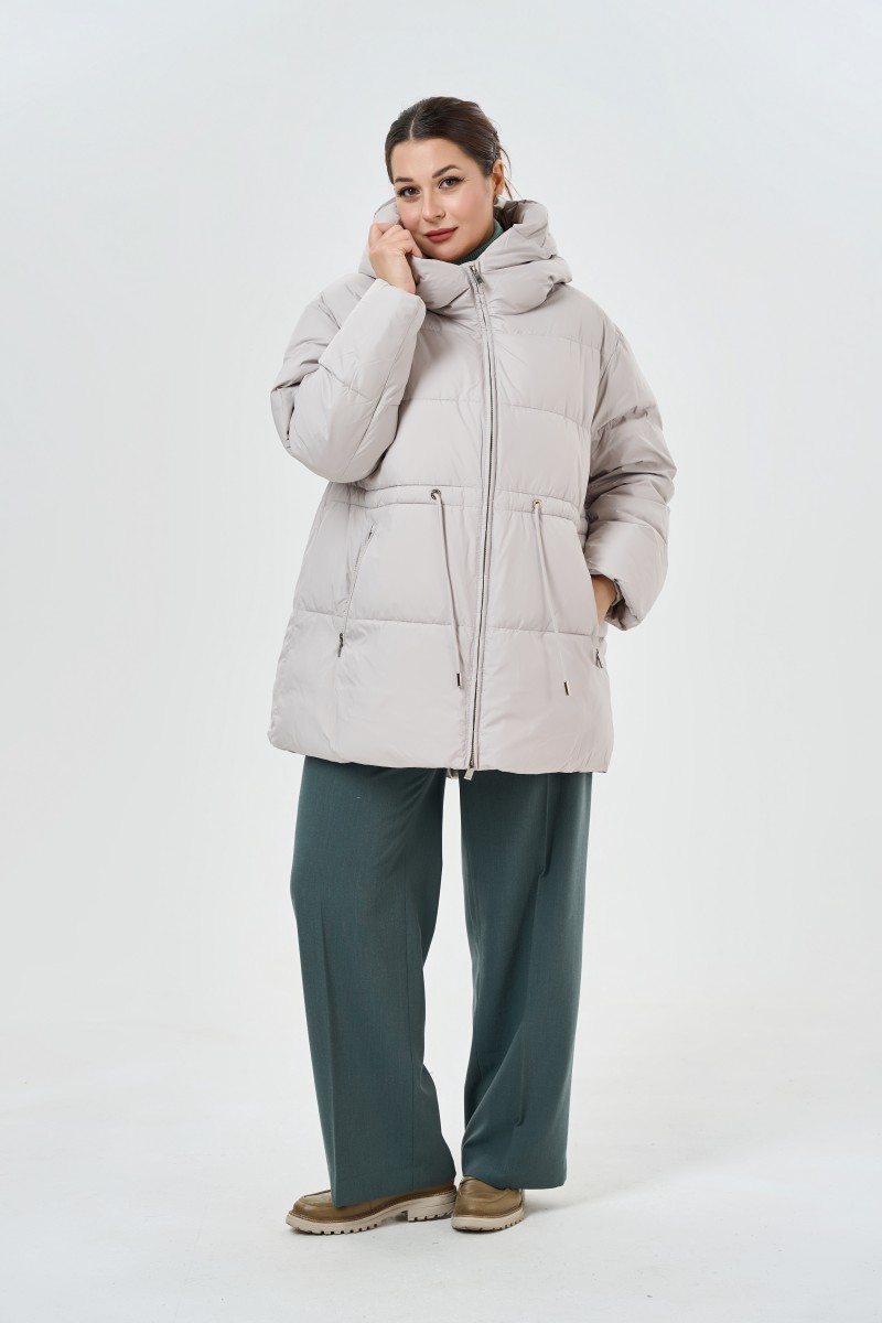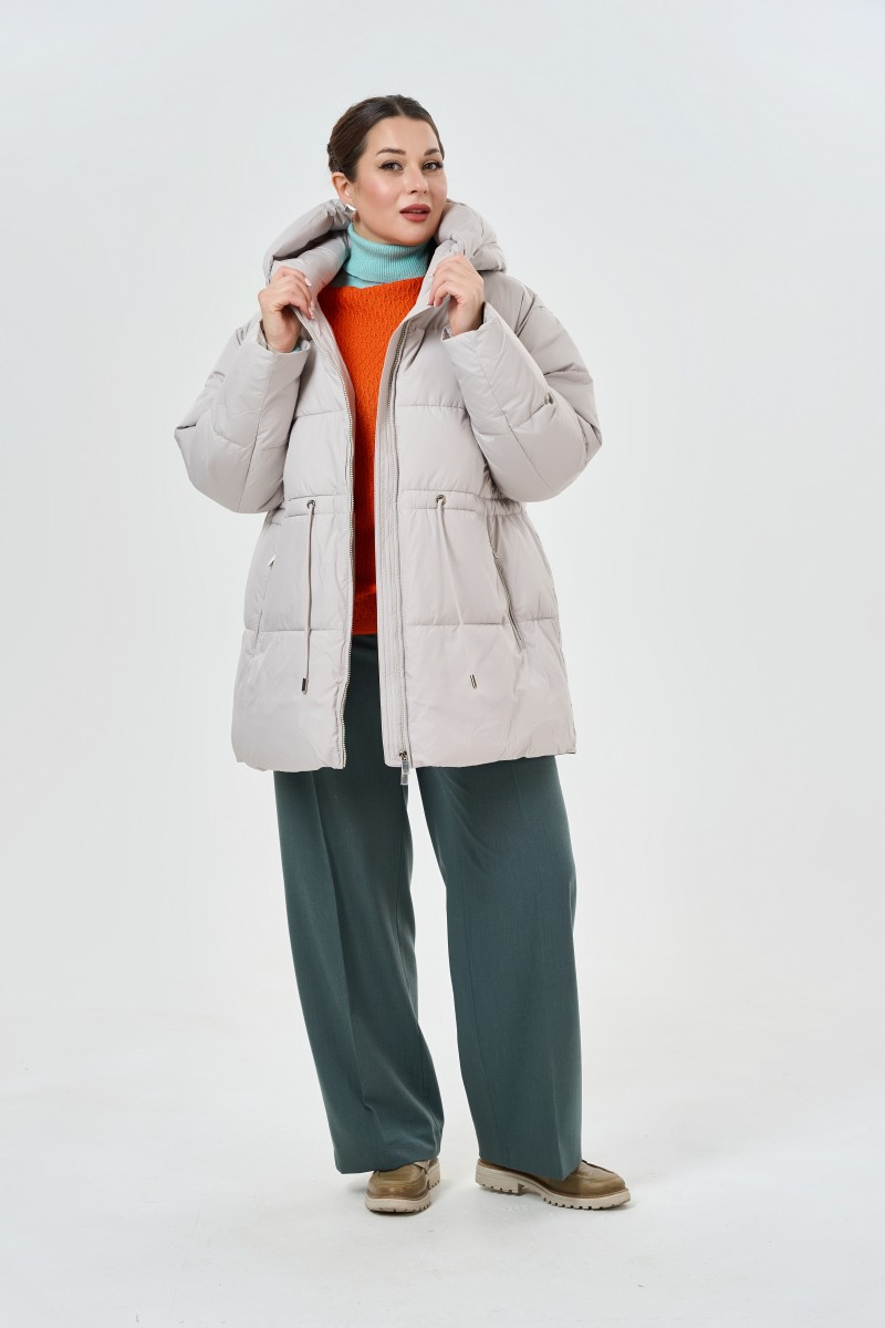 Современный пуховик в благородном бежевом цвете станет основой зимнего гардероба. Высокий воротник-стойка надежно защищает от ветра а объемный капюшон дополнительно укрывает в непогоду. Главная изюминка модели – регулируемый пояс на спине который позволяет создать более приталенный силуэт и подчеркнуть фигуру.Удобные карманы на молнии расположены по бокам – в них поместятся все необходимые мелочи. Рукава дополнены мягкими трикотажными резинками которые не пропускают холодный воздух и создают дополнительный комфорт. Основная молния проходит по всей длине изделия что делает процесс надевания максимально простым.Качественный утеплитель обеспечивает отличную терморегуляцию даже в сильные морозы. Этот пуховик прекрасно сочетается с зауженными брюками и высокими сапогами для прогулок по городу. Для делового образа можно выбрать прямые брюки и строгую обувь. Универсальный бежевый оттенок гармонично смотрится как с яркими аксессуарами так и в монохромных образах.