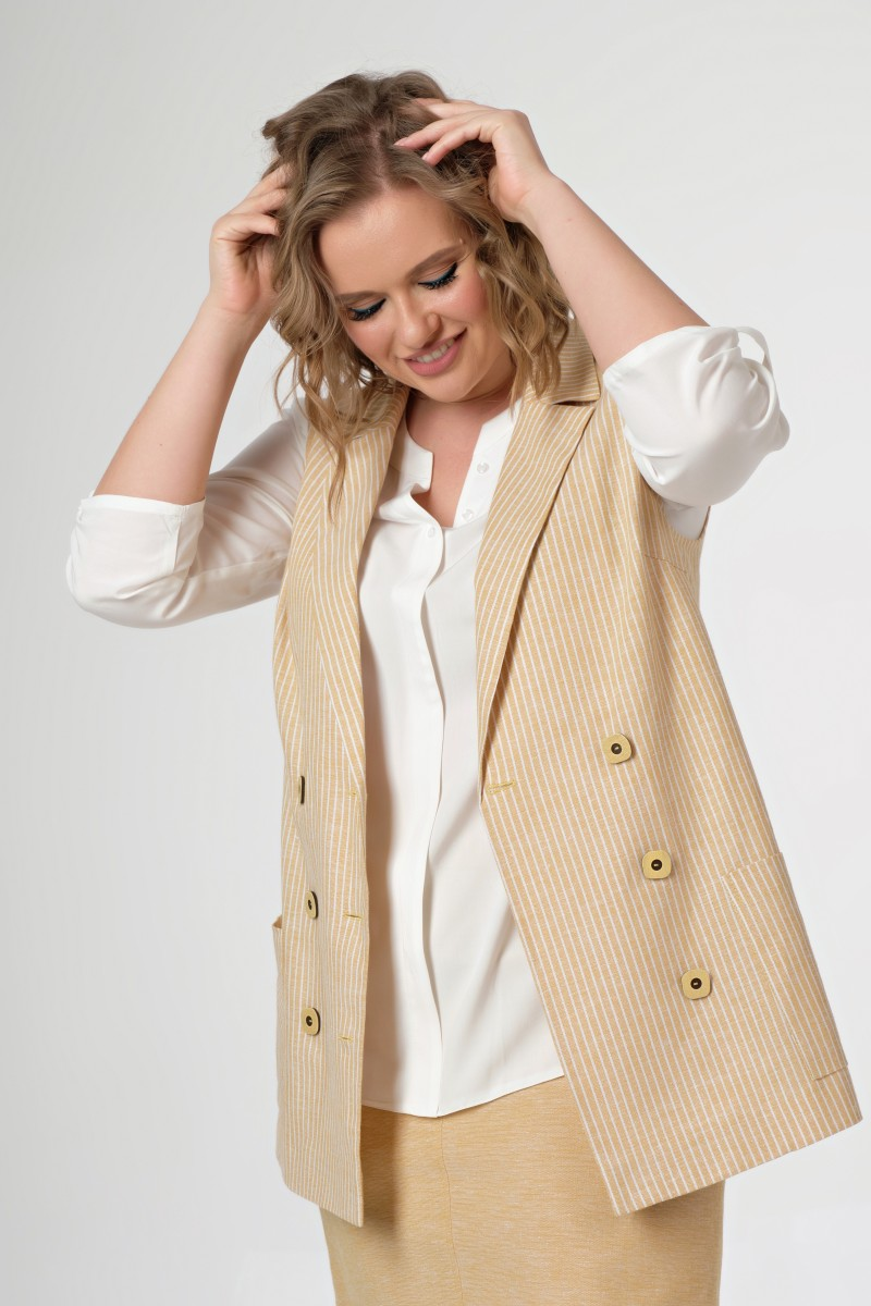 Двубортный жилет из льна становится основой для создания многослойных образов в духе современной классики. Четкие линии силуэта и накладные карманы добавляют структурированности любому луку.