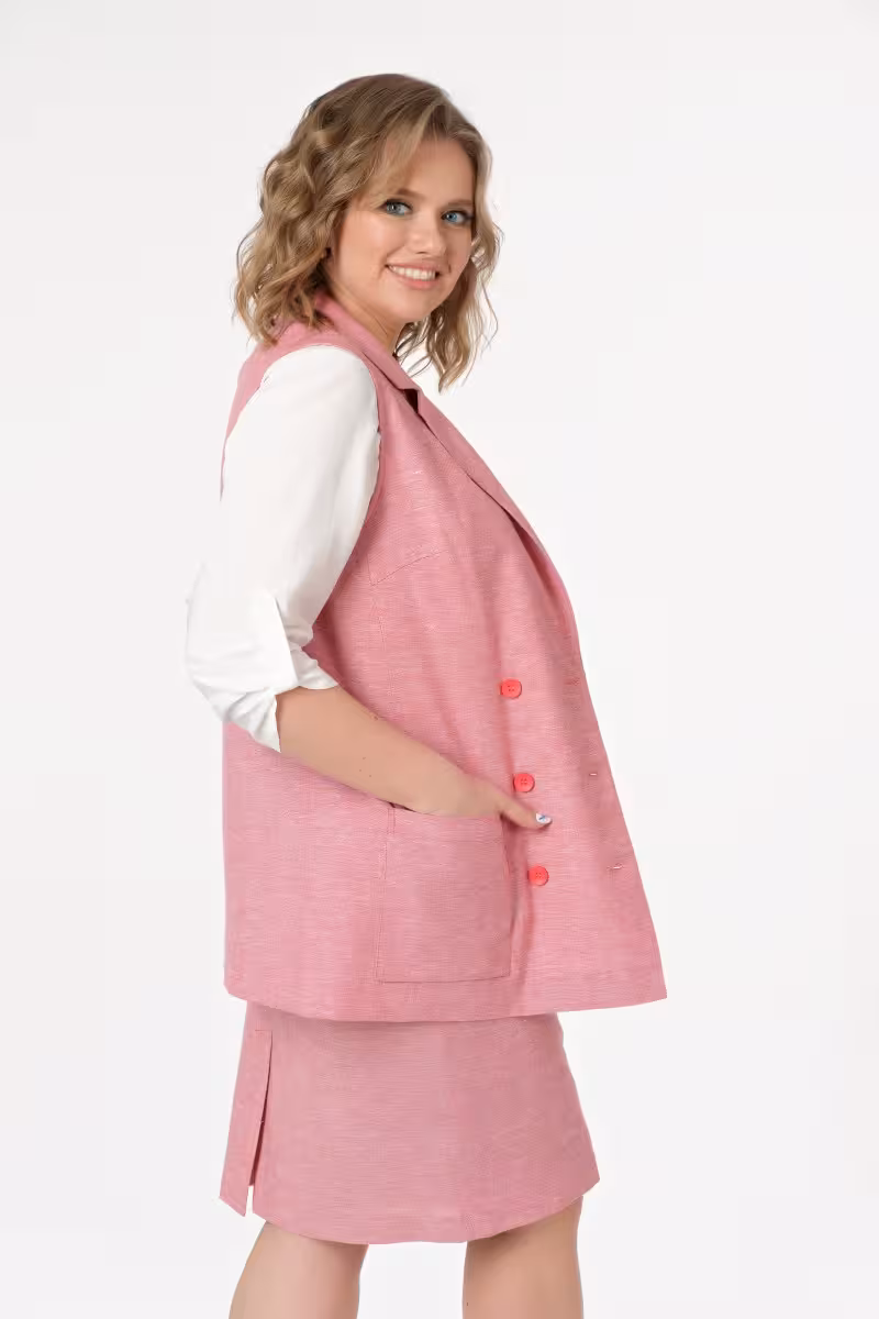 Двубортный жилет из льна станет основой для создания продуманных образов в деловом стиле. Отложной воротник и структурированный силуэт добавляют серьезности любому луку будь то встреча с партнерами или важная презентация. Льняная ткань обладает естественной фактурой и дышащими свойствами что особенно ценно в теплое время года.Накладные карманы прямоугольной формы не только украшают модель но и добавляют практичности. Они идеально подходят для хранения мелочей и создают дополнительные вертикальные акценты. Полуприлегающий силуэт подчеркивает фигуру не сковывая движений.Этот жилет прекрасно сочетается с прямыми брюками и блузкой для офисных будней. В паре с зауженными брюками и топом он создаст элегантный образ для вечернего выхода. Для более расслабленного лука можно надеть его с брюками свободного кроя и футболкой.Натуральный лен делает эту вещь незаменимой в путешествиях и на деловых встречах где важен комфорт и респектабельный внешний вид.