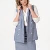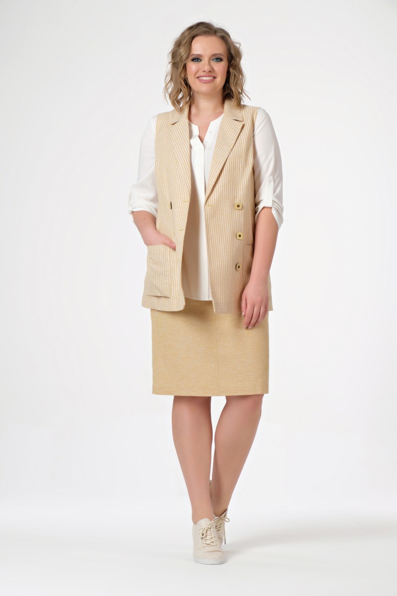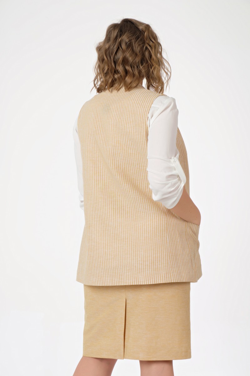 Жилет полуприлегающего силуэта двубортный с отложными лацканами до линии талии. Перед с нагрудной вытачкой выходящей из рельефного шва с накладными боковыми карманами прямоугольной формы. Воротник отложной.